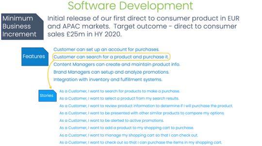 Figure 1 below is from the software development product team formed as an initial adopter of agile that Zsofia supported. This is the minimum business increment (MBI) decomposed into features and identified stories for one feature.