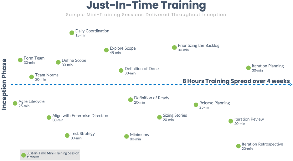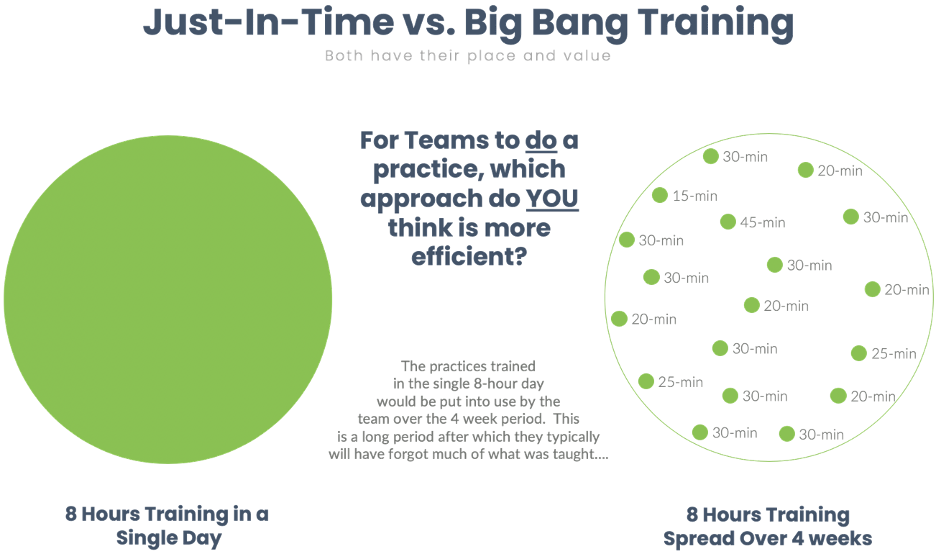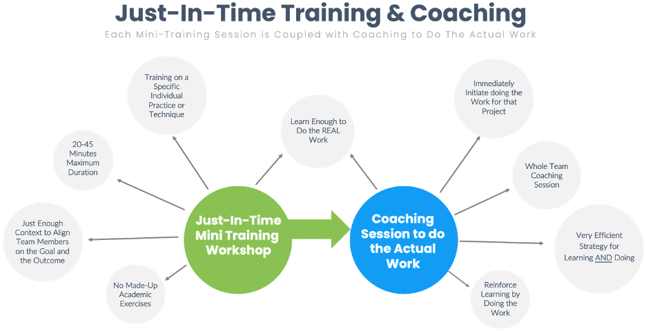 We’ve taken the most widely selected practice options from DA, developed a vast set of cohesive modules that can be chosen from to form the just in time training plan for any given team. These modules take anywhere from 15 minutes to only 45 minutes to deliver. They provide just enough context for teams to immediately put that learning into action, as they then do the work. Figure 3 depicts the powerful combination of JIT training & coaching.